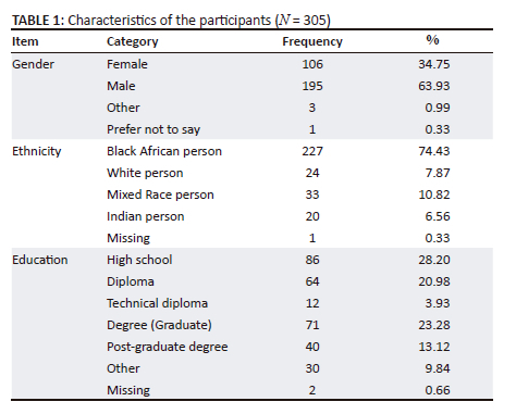 The participants consisted of 64% males and 35% females. Only 1% selected other and 0.33% opted not to state to which gender category they belonged. The ethnicity or race breakdown comprised of 74.4% black African, 11% Mixed Race, 8% white and 7% Indian; with the average age being 34.69 years (standard deviation [SD] = 7.51). Qualifications ranged from high school (28.2%); diploma (21%); technical qualification (4%); degree (23.3%) and post-graduate degree (13.0%). A total of 10% selected 'other' under educational qualification, and two participants did not complete an answer. South African employees formed the majority (73%) of the participants, with 27% comprising employees from countries where the organisation had a presence. It is worth noting that of the South African employee participant group, 34% comprised of foreign national employees employed in South Africa. The researcher was satisfied that the participants represented a diverse population group in terms of race, gender, nationality and educational level.