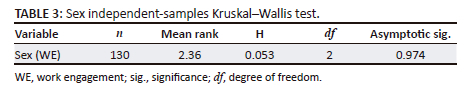 The independent-sample Kruskal-Wallis test was performed to explore if work engagement is experienced differently based on the biographical variables. This analysis also assesses Hypotheses 4.2-4.7 of this study.