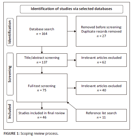 RESEARCH APPROACH/DESIGN AND METHOD: To conduct the scoping review, the Preferred Reporting Items for Systematic reviews and Meta-Analyses (PRISMA) guidelines were followed, and selected databases were searched for peer reviewed empirical articles between 2014 and 2024. Results were summarised and thematically categorised with regard to the objectives of the paper.