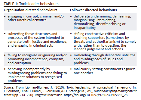 Contrary to common belief, toxic leaders need not exhibit destructive behaviours in all situations, nor use the same destructive behaviours all the time. To this end, Lipman-Blumen (2010) identifies an extensive list of behaviours that toxic leaders can exhibit (see Table 1).