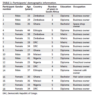 The population is described as the number of EEs living in Durban, South Africa. The study's target population was approximately 200 000 expatriates who reside in Durban, South Africa. Thirty individuals were selected to participate in this study by applying a nonprobability snowball sampling technique. These individuals included small business owners from Africa. The number of participants who participated in this study was 18. Table 1 provides participant demographic information.