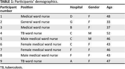 Purposive sampling of a maximum variation type12 was used to select a variety of representative focus group participants believed to have the necessary TB control knowledge needed in this study. The participants in the focus group discussions varied, comprising the deputy manager of nursing, laboratory staff members, surgical ward nurses, ARV clinic nurses, TB focal point staff, paediatric ward nurses, OPD/casualty nurses, X-ray staff members, TB ward nurses, medical ward nurses, infection control nurses, OHS nurses, pharmacy staff members, sub-acute ward nurses, maternity ward nurses and psychiatric ward nurses. Although doctors were amongst the population targeted for this study, they did not consent to participation and thus did not take part in the study.