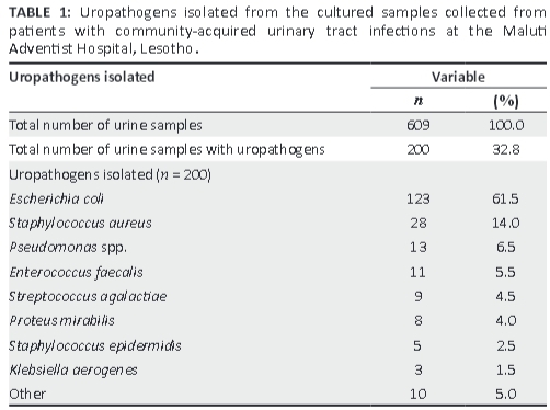 The authors would like to acknowledge Mr Sam Sinkoto, head of Maluti Hospital Laboratory services, for his support and for allowing the study to be conducted; and Ms Matsepo T. Mofokeng (microbiologist) for her valuable time and commitment in the laboratory. The Maluti outpatient department medical staff is thanked for their assistance in selecting and processing patients for urine collection to the laboratory. In addition, the authors would like to acknowledge Mrs T. Mulder, medical writer, School of Medicine, University of the Free State, for technical and editorial preparation of the manuscript.