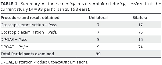 The hearing screening test results can be obtained in only a few seconds as DPOAE screening devices conveniently feature pass-fail algorithms.3 Screening methodologies that include automated response detection are preferable to the screening methodologies that require operator interpretation. Therefore, to decrease tester error, a programmed OAE machine with pass or fail criteria is recommended40 and was employed for the purposes of the current study. The audiological screening results obtained, per participant, across the two screening sessions, were recorded using the data collection form. The screening results were recorded across the pass/refer category. The term refer was used in place of the term fail, with the aim of emphasising that not passing the screening session indicates necessity for follow-up testing to confirm or exclude the presence of a hearing impairment.41