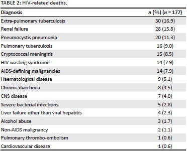 Amongst the patients reviewed, 82.0% died of HIV and/ or AIDS-defining conditions, whereas 18.0% had non-AIDS-defining diseases. The underlying causes of death and frequencies are shown in Table 2. Extra-pulmonary tuberculosis accounted for most deaths, followed by renal failure, Pneumocystis jirovecii pneumonia, cryptococcal meningitis and HIV wasting syndrome.