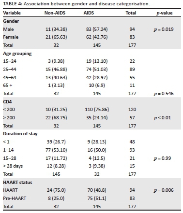 Table 4 shows the relationship between variables and HIV clinical diagnosis. More male patients died of AIDS-defining diseases compared to females, and the difference was statistically significant, (57.24% versus 42.76%; p-value < 0.05), All age groups were at the same risk of dying either from AIDS-defining conditions or a non-AIDS-defining condition (p = 0.546). Moreover, for these two groups of patients there were no differences in length of hospitalisation (p = 0.99), In addition, more patients with CD4 counts of less than 200 cell/ mm3 died of AIDS-defining conditions than those with CD4 counts of more than 200 cells/mm3 (75.86% versus 31.25%; p < 0.05). Furthermore, more patients who were on HAART in the study group died of a non-AIDS-defining illness than pre-HAART patients, and the relationship is statistically significant (75.00% versus 25.00%; p= 0.006).