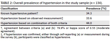 The overall prevalence of hypertension in the Ibusa community was 44% (Table 2), as determined according to the reported hypertensive status or measurements during the survey.
