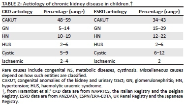 The conditions that account for CKD in childhood, with a predominance of congenital and hereditary disorders, differ substantially from those in adults. To date, mutations in more than 150 genes have been found to alter kidney development or specific glomerular or tubular functions.14 Most of these genetic disorders present during childhood, and many lead to progressive CKD. Congenital anomalies of the kidney and urinary tract (CAKUT) account for the largest category of CKD in children (Table 2) and include renal hypoplasia/ dysplasia and obstructive uropathy. Important subgroups amongst the renal dysplasias are the cystic kidney diseases, which originate from genetic defects of the tubulo-epithelial cells' primary cilia. Many paediatric glomerulopathies are caused by genetic or acquired defects of the podocytes, the unique cell type lining the glomerular capillaries. Less common but important causes of childhood CKD are inherited metabolic disorders such as hyperoxaluria and cystinosis, and atypical haemolytic uraemic syndrome, a thrombotic microangiopathy related to genetic abnormalities of complement, coagulation or metabolic pathways.