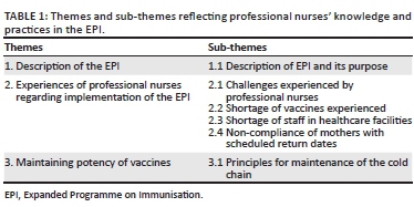 Themes and sub-themes that reflect professional nurses' knowledge and practices of EPI in the selected clinics in the Capricorn District of Limpopo Province are reflected in Table 1. The themes and sub-themes are discussed, and literature presented to support the study findings. Direct excerpts from participants' narratives are included to confirm the interview sessions conducted by the researchers.