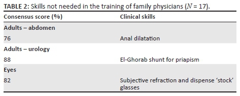 The skills list generated by this study represents a new national consensus on the clinical skill outcomes for postgraduate family medicine training programmes in South Africa. Consensus was reached on 242 core clinical skills, from which the panel decided that 211 should be retained, 3 should be deleted and 28 should be made elective. The panel could not reach consensus on 11 skills in the final questionnaire.