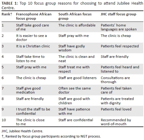 Six participants were recruited for the JHC staff focus group, 10 in the Francophone African focus group and 9 in the South African focus group. The staff focus group produced 28 responses to the question 'what are some of the reasons why you have chosen to attend Jubilee Health Centre?' The Francophone African focus group resulted in 19 responses and the South African focus group provided 36 responses. Table 1 shows the top 10 ranked answers from each focus group. These 30 reasons for choosing to attend JHC were collated to provide 15 statements which were used in the survey (see Table 3) to be agreed or disagreed with using a Likert scale.