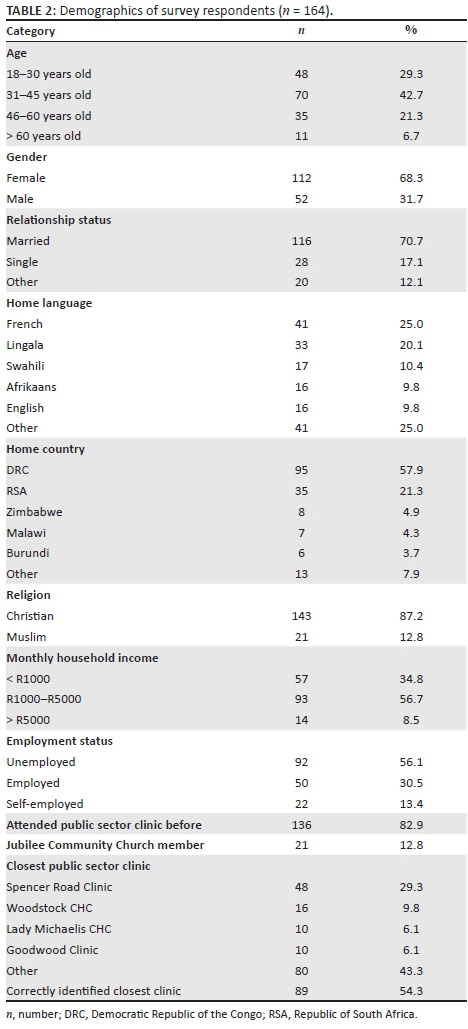 The patients surveyed were predominantly female, married and between the ages of 31 and 45 years. Only 21.3% of the patients were from the Republic of South Africa (RSA) with the majority (57.9%) from the Democratic Republic of the Congo (DRC). Accordingly, French, Lingala and Swahili were the most commonly spoken home languages. Those identifying with the Christian faith made up 86.6% of the patients (only 12.8% attending Jubilee Community Church) with a small but significant number of Muslim patients (12.8%). The average socioeconomic status is shown by the fact that 56.1% of patients were unemployed with the average, monthly household income between R1000 and R5000. The vast majority (82.9%) had attended a public sector clinic before, with Spencer Road Clinic (in Observatory) the most common closest public sector clinic. However, only 54.3% of patients were able to correctly name their closest public sector clinic. Based on residential suburbs (actual physical addresses were not recorded), it was calculated that on average, unemployed patients travel just over five times further to get to JHC (9.7 km) than would be needed to get to their closest public sector clinic (1.8 km), with 34.2 km the furthest distance travelled to get to JHC by an unemployed patient.