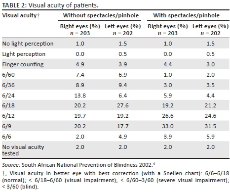 Findings of this study are in line with the three main causes of blindness in South Africa, which are refractive disorders, cataracts and glaucoma.4 Preventing and treating visual impairment have a significant impact on the quality of these patients' lives - socially and economically. Furthermore, diabetic patients have a higher risk for the development of glaucoma19 and cataracts,15 impacting even more the vision of the diabetic patient.