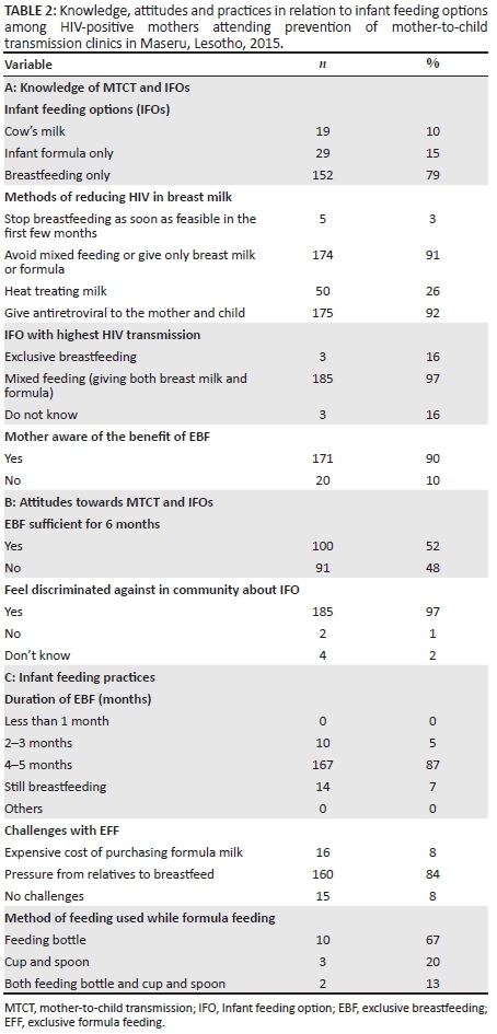 The mothers' knowledge of MTCT through infant feeding was good. Most of the mothers (152, 80%) were aware of the two main IFOs (breastfeeding and IF), while only 39 (20%) had knowledge of other feeding options. Ninety-four per cent of the mothers (179) were aware of the risk of transmitting HIV to their infants during breastfeeding.