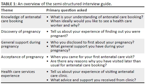 We used semi-structured interviews and focus group discussions to gather information. The interview guide was developed from a review of the literature and discussion within the multiprofessional group comprising a family physician, midwives and a general practitioner. A pilot study pretested the key questions to be used during participant interviews as well as the interviewing technique. A 24 year old multigravid participant was interviewed and we transcribed and analysed the data inductively to determine if the research question elicited the desired information. Modifications were made as suggested. The interview guide is summarised in Table 1.