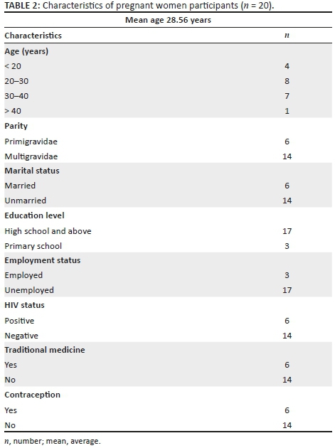 There were 20 pregnant women who participated in this study. All spoke IsiXhosa and were of African ethnicity. The mean age of participants was 28.56 years (18-41). The ANC records were used for gestational age. The mean gestational age at ANC booking was 22.37 weeks (20-28). The mean gestational age at diagnosis of pregnancy was 7.91 weeks (4-16).