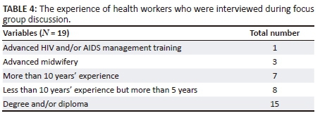 The sampling frame was the list of public healthcare workers, including community caregivers, employed in the four selected sites. The sampling unit was any healthcare worker or community caregiver who had worked for over a year with the PMTCT programme in the four selected study sites. Patients were purposively sampled in their respective four public healthcare facilities who met the criteria of being pregnant, attending antenatal care services and receiving PMTCT services in the four study sites. The sampling frame included a list of all pregnant women attending antenatal care in the four study sites. The sampling unit was any pregnant women attending antenatal care who had been receiving PMTCT services in the selected sites. The sample consisted of 19 nursing staff, 2 community caregivers and 40 pregnant women who were purposively selected for this study.