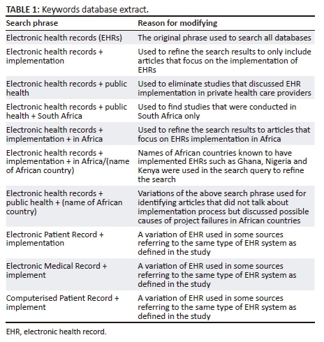 The literature that was analysed was sourced from Google Scholar, Science Direct, the PubMed Library, Scholar Droid, ResearchGate and the Association for Computing Machinery (ACM). An exhaustive search on the selected sources to identify all articles that fit the inclusion criteria was undertaken. The search included all articles that met the inclusion criteria regardless of the type of studies they were derived from. The study included all types of articles as long as they have addressed implementation of EHR in public health care. The context of the articles had to be African because the study wanted to consider examples from countries that were lower in terms of development thereby offering comparable circumstances to some of the rural and remote areas of South Africa. The articles were published between 2006 and 2017 to accommodate for the slow adoption of technology in Africa. A forward and backward search strategy was adopted to ensure that all useful references were included in the review. The strategy was implemented in such a way that if a relevant source had been identified, any sources that were cited in that study were also checked, thus completing the backwards step. The forwards step was completed by searching any sources that cited the identified relevant source. A database of the various keywords used in the search process was compiled detailing the multiple keywords and the reasons they were included in the search process. An extract of the keywords database is shown in Table 1. The full articles were downloaded from the various databases and analysed independently by two researchers. After the manual analysis was completed, the researchers compared their results in order to reach a consensus as to which of the articles should be included in the study.