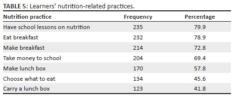 With regard to nutrition-related practices, the study found that the majority of learners could make their own breakfast and also had breakfast. A similar study conducted by Lin et al. with elementary children found that only 25% of these children ate breakfast even though they could make their own breakfast.3 The lunch box practice however was contrary to the findings of the study conducted by Abrahams et al. in the Western Cape Province of South Africa, where they found that about 70% of learners carried lunch boxes to school. The majority of learners in both cases indicated they could prepare their own lunch boxes.3,18