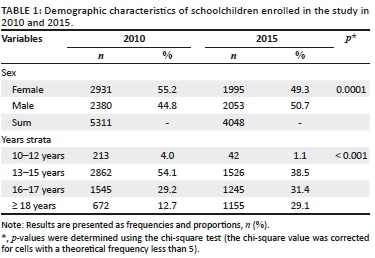 METHODS: Two cross-sectional studies were conducted in 2010 and 2015 in the middle and secondary schools of the Gharb Region. Multistage cluster sampling was used. The information was collected using a self-administered questionnaire