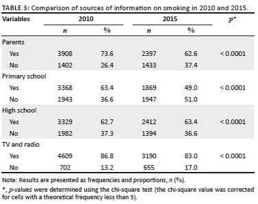 On the other hand, our results showed that in the 2010 study, parents, primary school and TV and radio were the primary sources of information to the students about smoking and its harmful effects compared to the study in 2015. This could be explained either by the differences in the two samples or the place of tobacco control in the primary and middle school curriculum, which may be less marked.