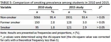Table 5 illustrates the prevalence of smoking among students in both studies. The comparison between the 2010 and 2015 studies shows that the prevalence of students who smoked increased in 2015 (2.9%) compared to 2010 (1.8%) (Table 5).