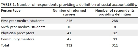 AIM: The aim of this article was to assess the degree to which medical students, preceptors and community mentors understand the concept of social accountability.