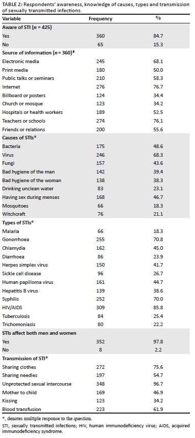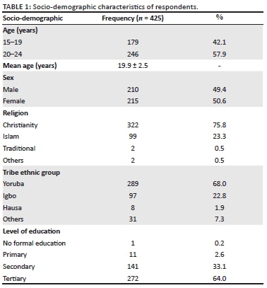 A total of 425 out of 450 questionnaires administered, which were adequately answered, were analysed with a response rate of 94.4%. The age range and mean age ± standard deviation (s.d.) of the respondents were 15-24 and 19.9 ± 2.5 years, respectively. Most (75.8%) of the respondents were Christians of Yoruba ethnicity (68.0%), and 64.0% had tertiary-level education (Table 1). Majority (84.7%) of the respondents were aware of STI, and most of them (76.7%) got information about STI from the Internet; teachers and schools (76.1%); and electronic media (68.1%).