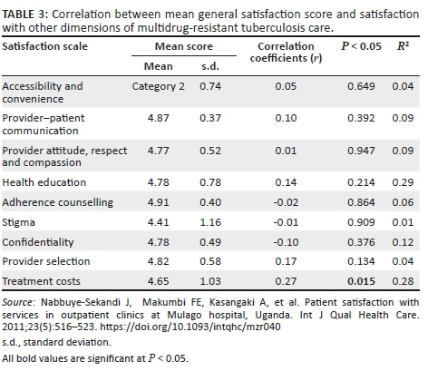 The sample for this study was relatively small (n = 78), and participants were selected purposively. Small samples may be inadequate to provide reliable correlations. Furthermore, the strength of association between general patient satisfaction and the dimensions of care that were significant was weak. Although the current study included a number of possible underlying dimensions of care influencing satisfaction, future studies with a broadened spectrum of dimensions of care may explain some of the differences in patient satisfaction reported in this research. In addition, satisfaction with healthcare services cannot be adequately assessed without accounting for a patient's self-perceived health status. Literature suggests that the overall satisfaction rating is significantly influenced by the patient's severity of illness.47,48 Although the present study excluded patients with MDR-TB who were too ill or had profound deafness from medication toxicity, future studies on patient satisfaction with the community-based MDR-TB model should include a measure of the participant's health status.