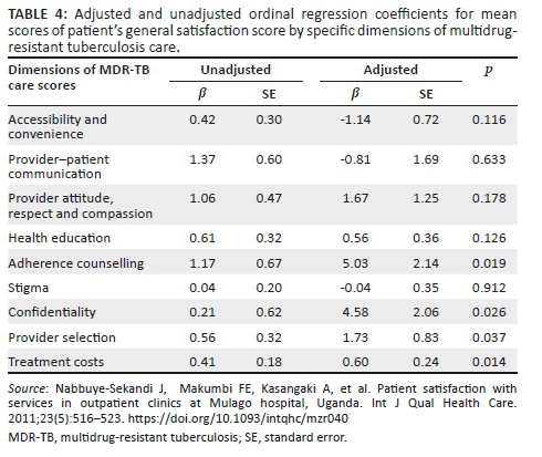 Ordinal regression models were used to predict regression coefficients for the mean general satisfaction score for each of the nine dimensions of MDR-TB services provided by CTSs (Table 4). All nine dimensions of MDR-TB services provided by CTSs were included as potential explanatory variables in the adjusted model. In the adjusted model, adherence counselling (p = 0.019), confidentiality (p = 0.026), provider selection (p = 0.037) and treatment costs (p = 0.014) significantly predicted mean general patient satisfaction.