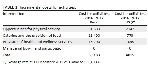 For physical activity, the incremental costs included the costs of equipment for functional exercise activities (e.g. mats, balls, skipping ropes) and the first Friday sports (e.g. colour powder). For catering activities, additional fruit was provided during outages. For health and wellness services the costs included the training of nine health professionals in brief behavioural change counselling. There were no incremental costs for the managers.
