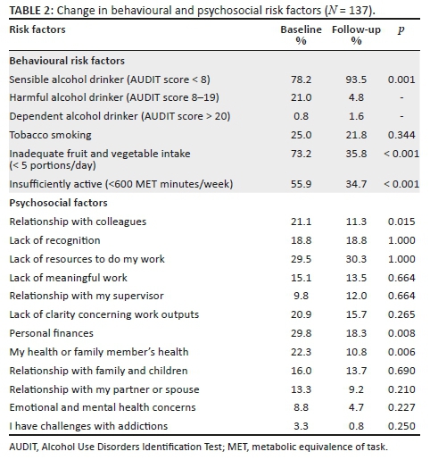 The HCW programme itself targeted the whole workplace-based population and not just individuals in its systematic changes to the environment, although it also included individual-level interventions such as behavioural change counselling. Implementation of WHPPs of this nature throughout SA workplaces could contribute to policy interventions that target the employed population.
