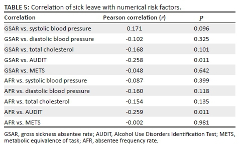 Tables 4 and 5 show the relationship between changes in sick leave and changes in risk factors. Overall, there was no meaningful correlation between sick leave and risk factors, although a decrease in alcohol intake was weakly associated with an increase in sick leave.
