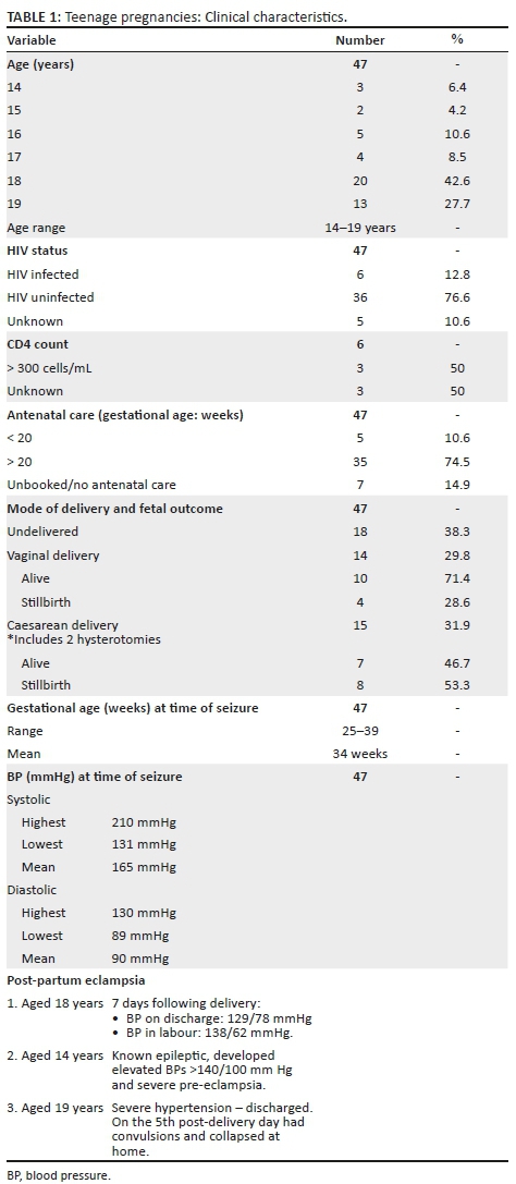 There were 47 cases of eclampsia in adolescents (aged ≤ 19 years) in the three-year study period and 10 were < 16 years (Table 1). Forty-two were tested for HIV and six (12.8%) were HIV positive; 40 patients had antenatal care and of these, 35 had booked for antenatal care after 20 weeks gestational age. Approximately 38% (n = 18) were undelivered and the caesarean delivery rate was 32% (n = 15).