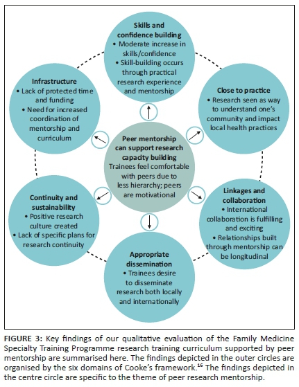 Typical measures to assess the success of research capacity building programmes include a number of peer-reviewed publications, presentations at conferences, grant applications and attainment of higher degrees; however, these are challenging to obtain in low-resource and early-career settings. In addition, these metrics fail to capture a primary goal of health research capacity building, which is to impact the health of and service delivery to the local community.15,16 Cooke's framework for evaluating research capacity building focuses on 'process' domains that are relevant to novice researchers and can be measured more proximally. It also focuses on 'outcome' domains that consider the community health impact of research, which are especially relevant to family medicine. These domains include: (1) building skills and confidence, (2) ensuring that research is 'close to practice', (3) supporting linkages and collaborations, (4) developing appropriate dissemination, (5) building sustainability and continuity and (6) investing in infrastructure.16 We, therefore, utilise Cooke's framework to evaluate the family medicine training programme's efforts to build research capacity through its research curriculum and a novel peer mentorship programme. This article describes the research curriculum, the peer mentorship programme and its evaluation.