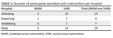 All children aged 1-59 months admitted to the paediatric wards of the three hospitals from 15 March to 15 May 2016 were eligible for the study. During 2014 and 2015, 153 of 1463 (10.5%) of the children aged 1-60 months admitted to the three hospitals were for malnutrition.9 Assuming a confidence interval (CI) of 95%, a sampling error of 5% and a response distribution of 50%, the minimum sample required for this study, as determined using Raosoft sample size calculator,10 was 306. This sample was proportionally divided among the three hospitals, based on their contribution in 2014 and 2015 to the total number of admissions. This resulted in 78 children being sampled from Heidelberg Hospital, 81 from Kopanong Hospital and 148 from Sebokeng Hospital.