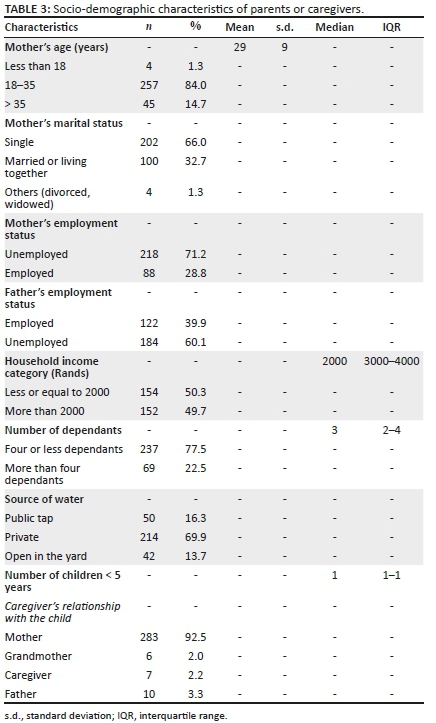 Most carers were the mother of the baby (92.5%, n = 283) and were aged 18-35 years (84.0%), single (66.0%) and unemployed (71.2%). In contrast, most of the fathers were employed (60.1%). Most households had four or less dependents (77.5%), private water source (69.9%) and total≈monthly income of 2000 Rands ($150) or less (50.3%) (Table 3).