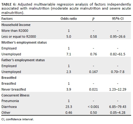 RESULTS: Most participants were male (59.8%), had normal birth weights (80.0%), come from a household with a monthly income R2000 (about 150 US dollars) (50.3%), up-to-date immunisation (97.4%), breastfed for 6 months (57.4%) and were fed 3-4 meals/day (66.7%) and, at most, one snack/day (63.4%). Acute malnutrition accounted for 9.5% (n = 29) of admissions. Among these, 82.8% (n = 24) had severe acute malnutrition. On test of association, monthly household income (p = 0.01), mother's and father's employment status (p = 0.01; p = 0.01), breastfeeding history (p = 0.01) and having diarrhoea in index admission (p = 0.01) were significantly associated with malnutrition admission. In multivariate regression analyses, not being breastfed (odds ratio [OR] = 3.9; 95% confidence interval [CI]: 1.23-12.29; p = 0.02) and diarrhoea at index admission were independently associated with malnutrition (OR = 23.3; 95% CI: 6.85-79.43; p = 0.01.