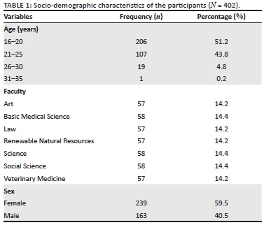 In all, 402 participants (59.5% female, 40.5% male) with a mean age of 20.94 ± 2.458 years participated in the cross-sectional survey aspect of the study (Table 1). The students were mostly between the age of 16 and 20 years and were distributed across the seven faculties (14.2% - 14.4%).