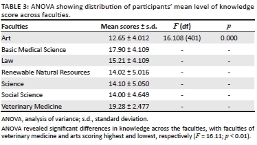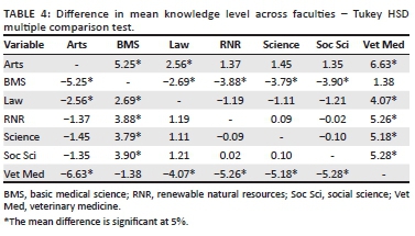 Participants' knowledge of CVD and its risk factors is shown in Tables 2 and 3. In Table 2, we observed that 39.1%, 35.1% and 25.9% of the participants had high, average and low levels of knowledge of the risks of CVD, respectively. The mean knowledge score of the participants was 15.31 ± 4.999. Table 4 revealed where these differences lie. The faculties of veterinary medicine and basic medical science had significantly higher scores than the other faculties. This table shows the faculty pair(s) that differed significantly after ANOVA testing.