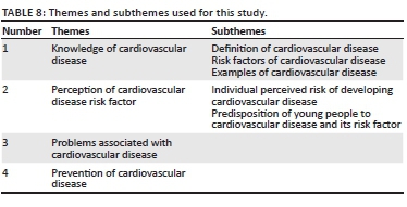 Qualitative study to further explain and explore the perception of CVD and its risk factors using focus group discussions was conducted (Table 6). During the discussion, knowledge of CVD, perception of CVD, types of CVD, problems associated with CVD and prevention of CVD were explored. A group of undergraduate students participated in the focus group discussion. Sixteen students (four male, 12 female) participated in the focus group discussion. Two focus group discussions were conducted, with the first group consisting of six participants (three male, three female) and the second group consisting of 10 participants (one male, nine female). For the purpose of the discussion, participants were called by numbers: 1, 2, 3 till 10. Participants were asked questions in relation to the aim of the study. Four themes were generated.