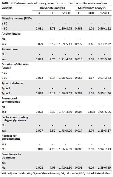 RESULTS: The mean age of participants was 46.9 ± 16.3 years, 68.4% were men, and 62.3% had Type 2 diabetes mellitus. Poor glycaemic control was present in 78% of patients. The independent determinants of poor glycaemic control were tobacco use (adjusted odds ratio [aOR]: 2.01 [1.77-5.20], p = 0.015), the presence of comorbidities (aOR: 2.86 [1.95-6.65], p = 0.007), the presence of a factor contributing to hyperglycaemia (aOR: 2.74 [1.83-3.67], p = 0.014), missing scheduled appointments (aOR: 2.59 [1.94-7.13], p = 0.006) and non-adherence to treatment (aOR: 4.09 [1.35-6.39], p = 0.008
