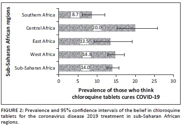 RESULTS: About 14% of respondents believed that CQ could treat COVID-19 and of which, 3.2% took CQ for COVID-19 treatment. Multivariate analyses revealed that respondents from Central (adjusted odds ratios [aOR]: 2.54, 95% confidence interval [CI] 1.43, 4.43) and West Africa (aOR: 1.79, 95% CI 1.15, 2.88) had higher odds of believing that CQ could treat COVID-19. Respondents from East Africa reported higher odds for uptake of CQ for COVID-19 than Central, Western and Southern Africans. Knowledge of the disease and compliance with the public health advice were associated with both belief and uptake of CQ for COVID-19 treatment