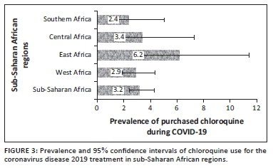 The prevalence and 95% CI of the belief in CQ as a cure for COVID-19 and uptake during the COVID-19 pandemic for the four sub-regions, respectively, are shown (Figure 2 and Figure 3). The prevalence of belief in CQ as a cure for COVID-19 was significantly higher in Central Africa (20, 95% CI: 15.2-25.8) and lower in Southern Africa (9, 95% CI: 6.2- 12.0; p = 0.001). Although there was higher uptake of CQ amongst East Africans during the pandemic, the difference was not statistically significant (p = 0.174). Of the 47 respondents in SSA regions who purchased CQ for COVID-19, 19 of them (40.4%) did not believe that CQ was an effective treatment for COVID-19.