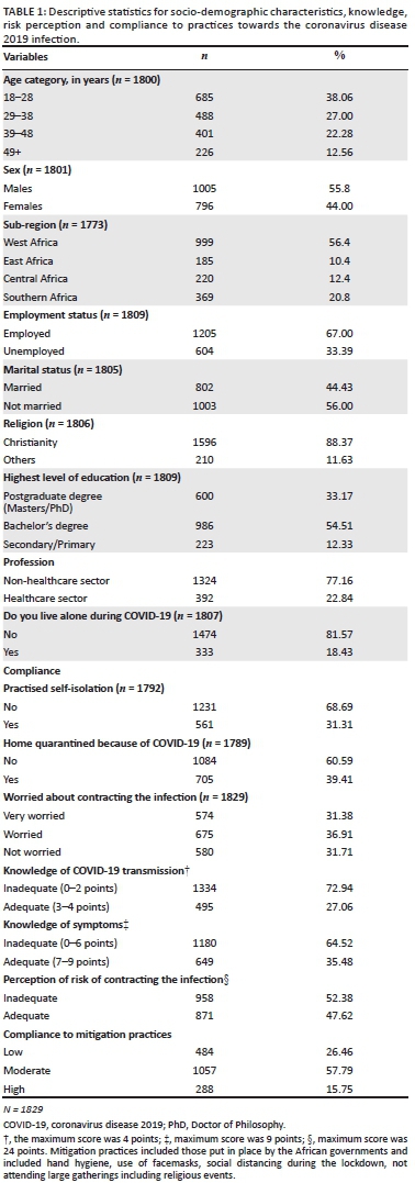 The independent variables included demographic (age, gender, marital status, country of origin [with Southern Africa as the base], education, employment and religion), practice (included compliance to mitigation practices of handwashing, self-isolation, quarantine and use of facemask when going out) and risk perception. Variables were summarised as counts and percentages for categorical variables.