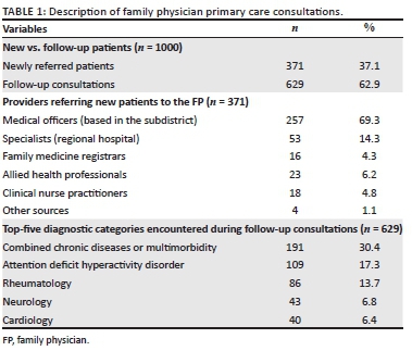 The FP reviewed referred patients at the hospital's outpatient department (OPD) on Mondays (for referrals from PHC clinics and down-referrals from specialists at the regional hospital) and visited three PHC facilities on Tuesdays and Wednesdays (distances between the hospital and these PHC facilities ranged between 3 km and 25 km). Patients were referred to the FP by the PHC team members through an internal booking system at each facility. These PHC team members included the subdistrict medical officers, family medicine registrars and allied health colleagues (mainly the occupational therapist for attention deficit hyperactivity disorder work-up, as well as the clinical nurse practitioners for review of patients on second-line antiretroviral therapy [ART]). The referral criteria were not fixed, as it was necessary to ensure that the team members felt comfortable referring patients for clinical input whenever they needed assistance. The FP encouraged learning conversations with PHC team members to decide whether to see patients at his clinic or whether it would be more appropriate to refer directly to the regional hospital specialist service to ensure a streamlined journey through the healthcare system. The FP also encouraged clinical nurse practitioners to discuss possible FP referrals directly with the medical officer on-site at the PHC facility, as often the medical officer would be able to confirm the need for FP referral or initiate a quick phone call with the FP to discuss the most appropriate care plan strategy for the patient. This triaging step was necessary to ensure the efficient use of the FP outreach service. Referrals to the FP from the regional hospital specialists were made either during their outreach visits to the Mossel Bay subdistrict or from the regional hospital OPDs (referrals made via email communication or written letters).
