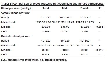The prevalence of hypertension was 27.9% (present in 61 persons). Systolic blood pressure of participants ranged from 70 mmHg to 220 mmHg with a median of 130 mmHg whilst DBP ranged from 40 mmHg to 110 mmHg with a median of 80 mmHg. The mean SBPs for males and females were 133.76 ± 17.67 mmHg and 129.27 ± 21.53 mmHg, respectively, whilst the mean DBP for male and female participants were 78.96 ± 12.55 mmHg and 78.77 ± 12.35 mmHg, respectively. Although the mean blood pressures were higher in males, statistically significant difference was not met (p = 0.151 and 0.919 for SBP and DBP, respectively; see Table 3).