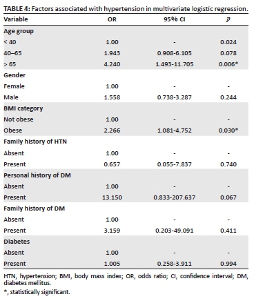 CONCLUSION: Hypertension was highly prevalent in this rural community. Health sensitisation and intervention programmes are recommended in rural communities for early detection and management of hypertension, especially amongst older and obese adults