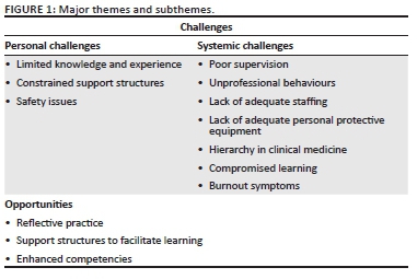Of the sampled group of 46 interns, 42% were in the first year of their 2-year internship period, 56% in the second year and 2% unknown. The majority of the interns were female (56%) and single (66%), and most did not have children (91%). Of the total number of 226 responses to open-ended items, 40% related to strengths, highlighting positive aspects, whilst 46% highlighted the negative aspects related to weaknesses (20%) and threats (26%). Fifteen per cent described opportunities that arose as a result of the COVID-19 pandemic. The major themes and subthemes are illustrated in Figure 1.