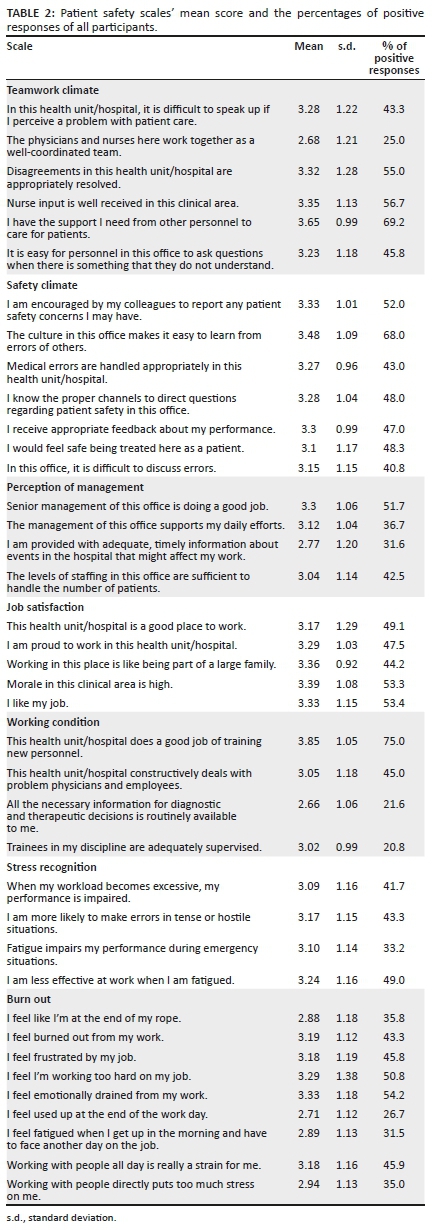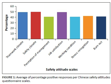 Table 2 displays the participants' mean scores for each item on the seven PS scales, as well as the percentage of positive responses. The scale with the most positive responses was safety climate 49.59%, which was followed by job satisfaction 49.5%, teamwork climate 49.17%, stress recognition (41.8%), burnout (41%), perception of management (40.63%) and working conditions (40.6%). The average percentage of positive responses per the CSAQ is shown in Figure 1.